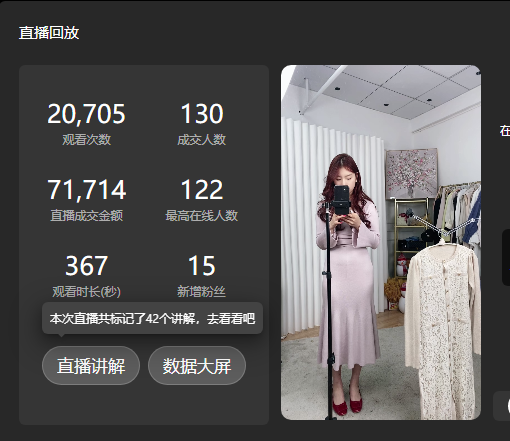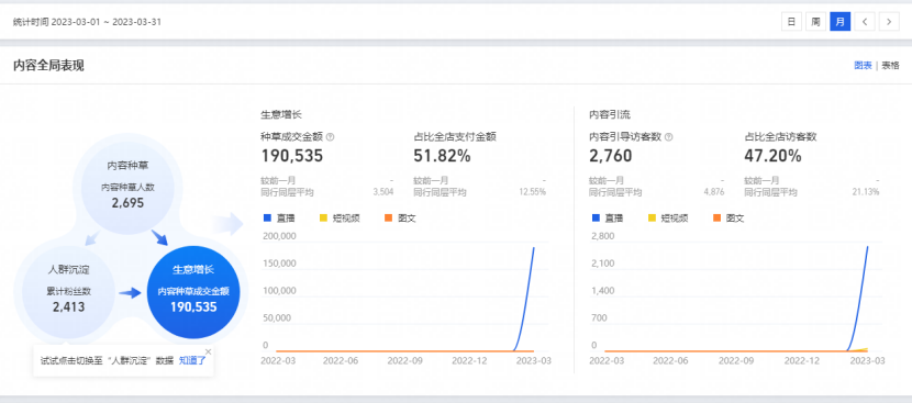 女裝店鋪面對廣大女性用戶,這一群體對愛美有著極大的興趣,而抖音直播間(興趣電商)的搭建,恰好為李萌(化名)的女裝店鋪提供了一個絕佳的流量通道,于是火蝠幫助李萌重新優化直播間的裝修風格,直播節奏,以及內容話術來吸引消費人群,助力女裝店鋪完成沖刺目標從而實現彎道超車,最終在直播賽道取得矚目成績,內容種草2695人,累計粉絲數2413,直播成交19萬。