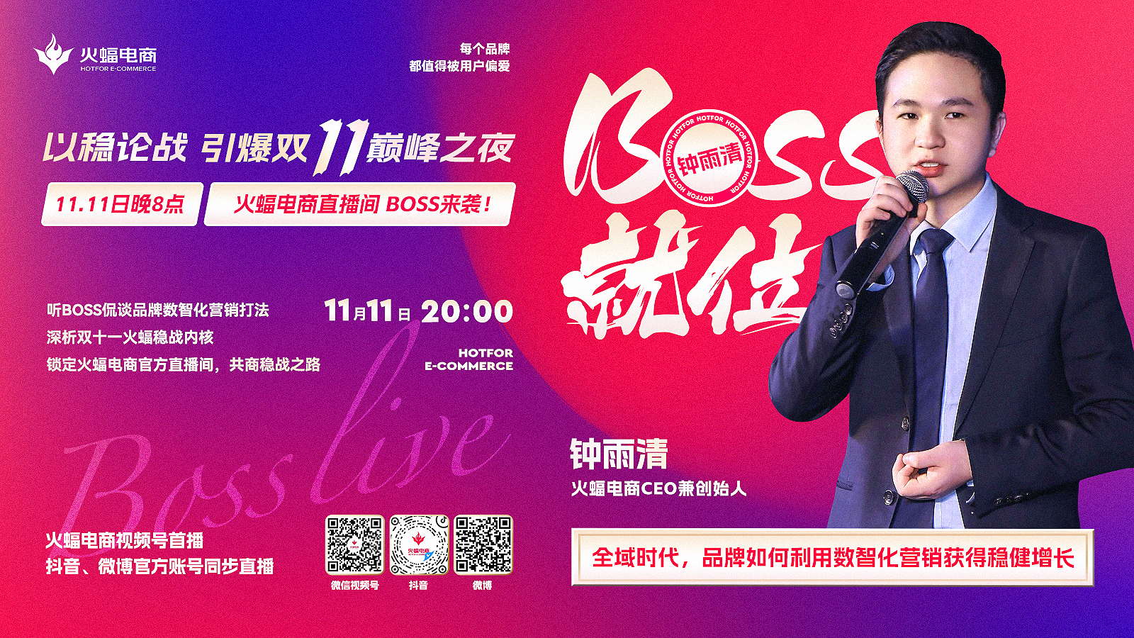 11月11日晚8點,敬請關注火蝠電商視頻號官方直播間,與火蝠電商CEO鐘雨清一起「穩(wěn)戰(zhàn)」破局,引爆雙十一巔峰之夜。